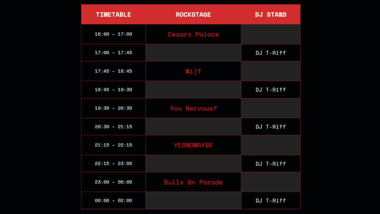Hier kan je zien welke band wanneer op ons podium staat, let wel: deze uren zijn onder voorbehoud!